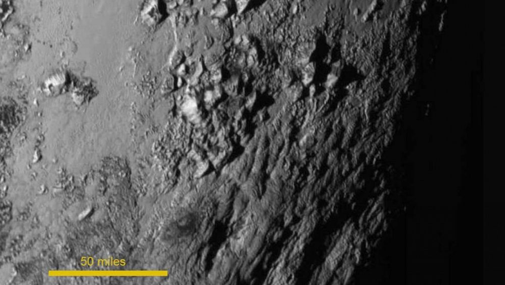 La nave espacial estadounidense New Horizons ha enviado las imágenes más cercanas hasta la fecha de Plutón en las que la NASA ha descubierto una gran sorpresa: una cadena de montañas jóvenes de unos 3.500 metros de altitud sobre la superficie helada del planeta enano que, probablemente se componen de hielo de agua del propio planeta.